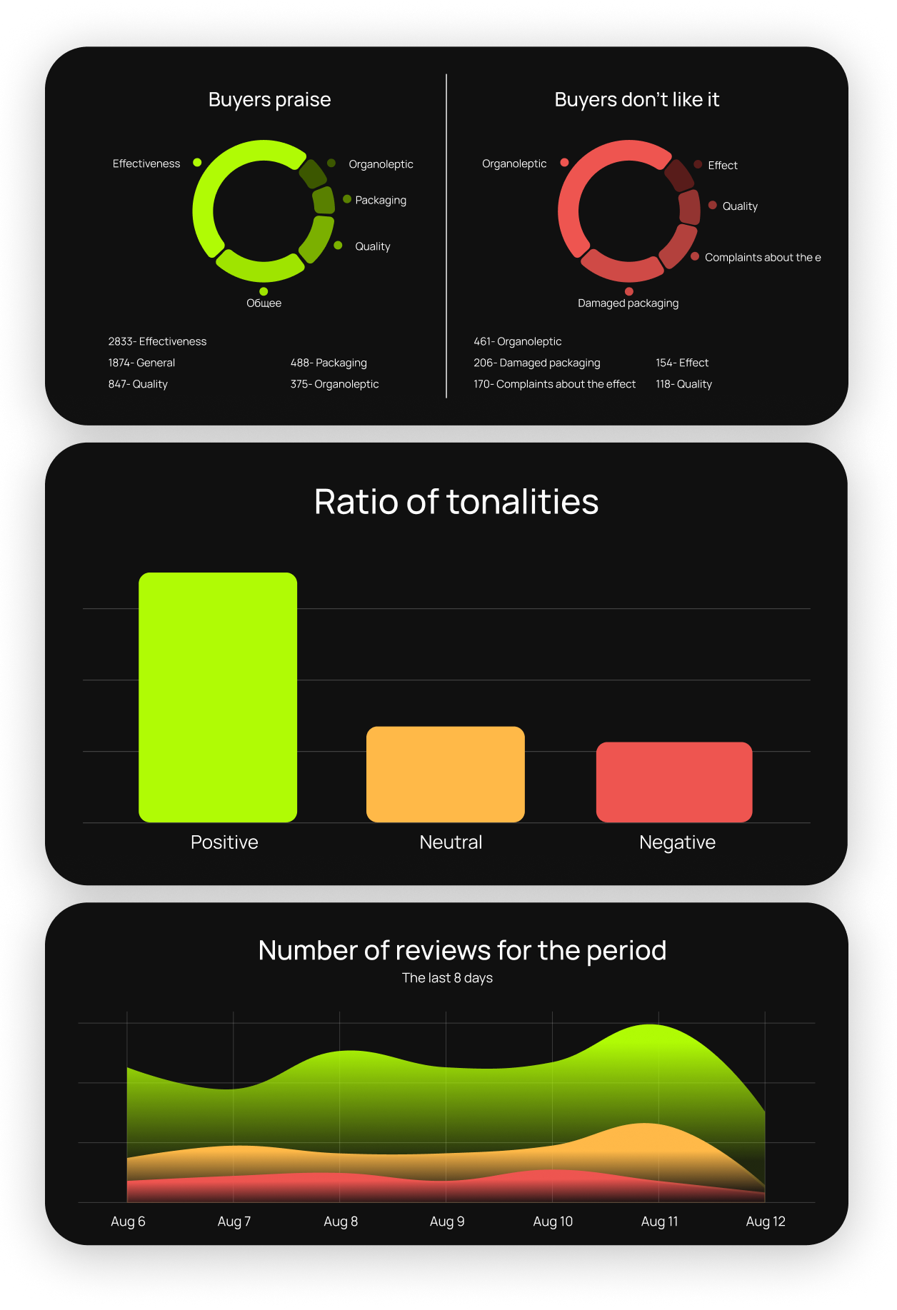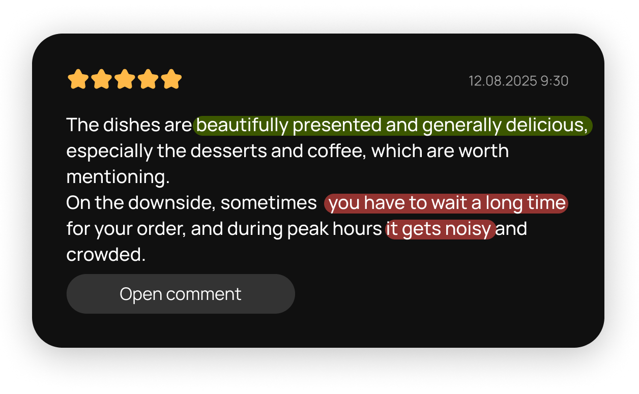 We analyze reviews by branch: you can see each location’s reputation, what people criticize and praise most, and Telegram helps a lot with fast responses.